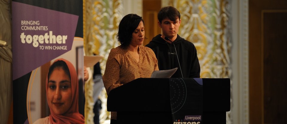Our neighbourhood campaign in Everton began with a listening campaign by our member institution Liverpool Hope University Creative Campus that involved students, local staff and local community organisations. Out of this listening, multiple issues came up including safety and facilities for young people in the area. At the Founding Assembly of Liverpool Citizens in November 2025, Amy, a Citizens leader from Hope University, alongside local teenager Joe, stood in front of the leader of Liverpool City Council, Councillor Liam Robinson, and 600 people and asked him to come on a neighbourhood walk to see some of these issues for himself and come up with an action plan.